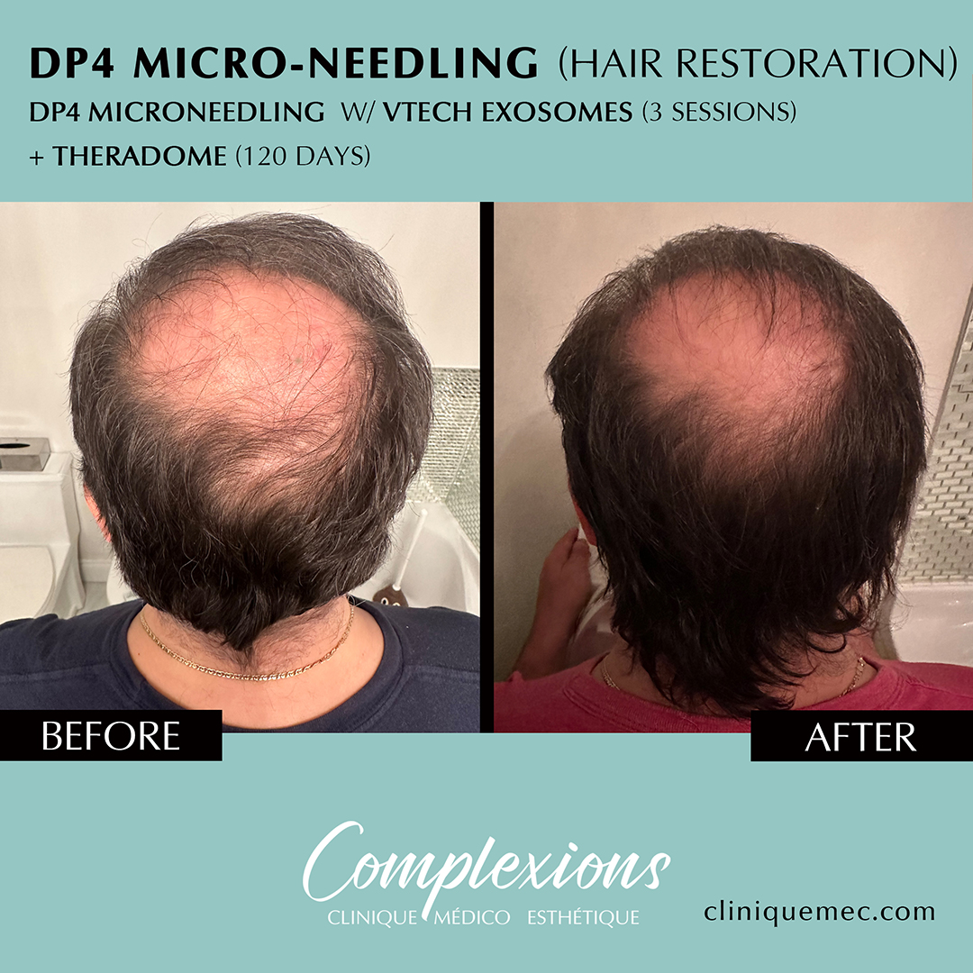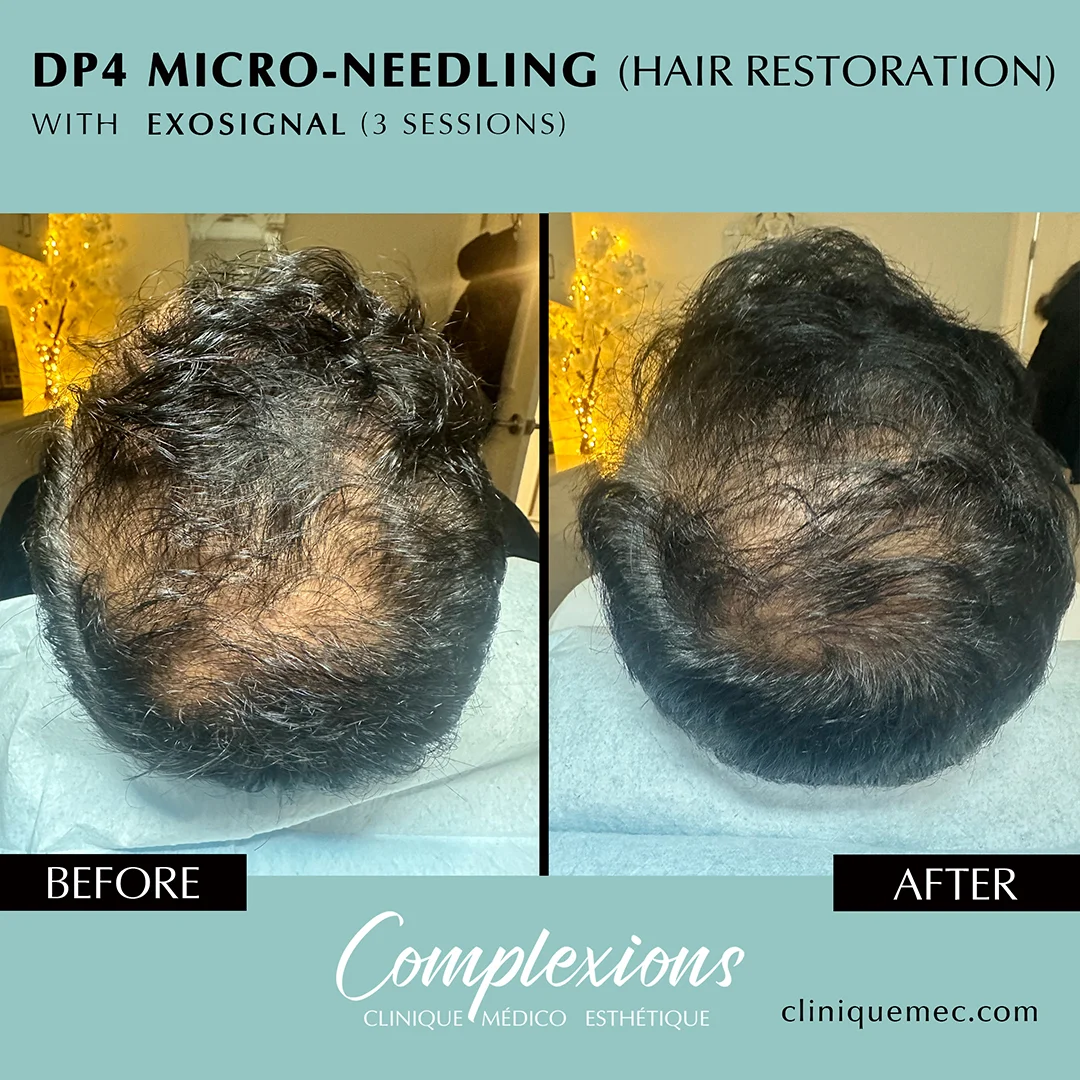 Le programme de Repousse des cheveux Laval & Restauration capillaire à la Clinique Médico Esthétique Complexions (Clinique MEC) est la solution de pointe pour contrer la perte de cheveux. Vanessa I. met en œuvre des traitements régénérateurs qui ciblent la racine même du cheveu.